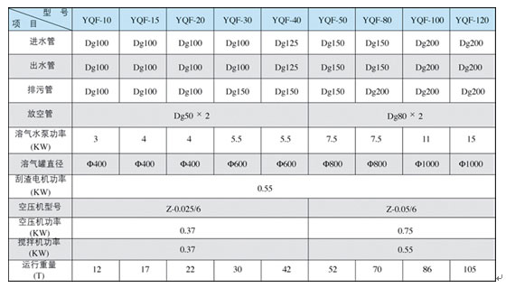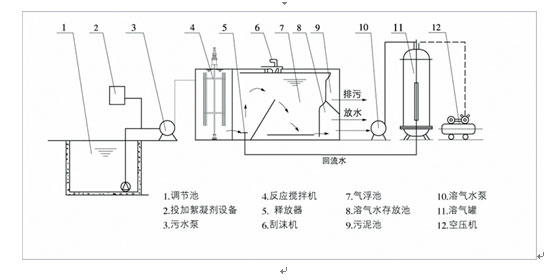 注:溶氣水回流比按30%設(shè)計;水力表面負荷:3~6m3/m2˙h;停留時間:15~30min。